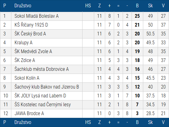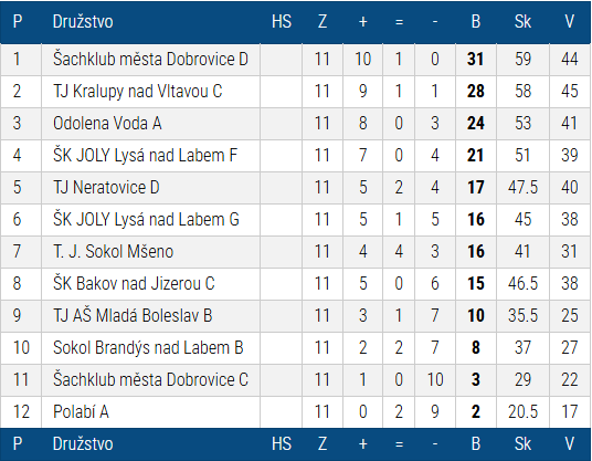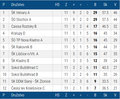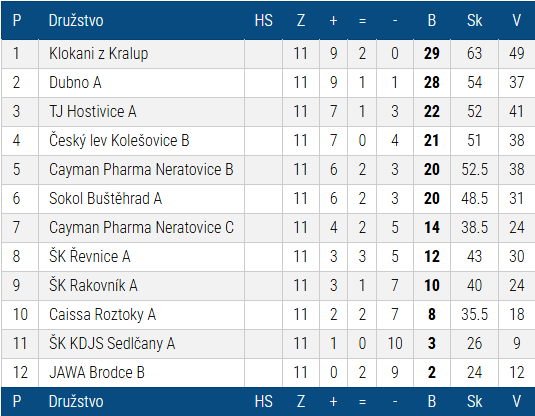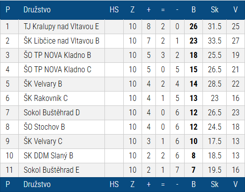 Tým A skončil 4. K postupu stačil bod více. Postupoval první a druhý. Tým B skončil 1. Tzn. může postoupit do Krajského přeboru a hrát s týmem A stejnou soutěž. Tým C skončil 2. Bohužel prohrál s prvním a to nás stálo postup. Tým D skončil 4. Mládež nasbírala cenné zkušenosti. Tým E skončil 1. Bez porážky! Právo postupu do Regionálního přeboru a hrát stejnou soutěž co tým C a D.