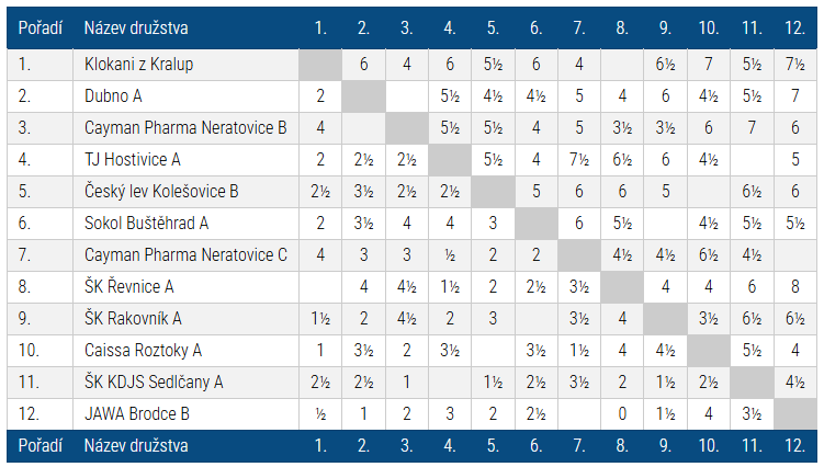 Vedli jsme tak 4:1 a dohrávali se tři partie. Rozhodujícím bodem přispěl Jirka Erban v partii, která …. no, hlavně že jsme zdraví. Své partie po dlouhém boji pak remizovali i Míša a Třéba a konečný výsledek zápasu tak byl 6:2. Děkujeme soupeřům za bojovný zápas a zajímavé partie. Stále se držíme v čele tabulky a k postupu chybí poslední vítězství. To získáme v posledním kole soutěže, 30.3. proti Řevnicím.