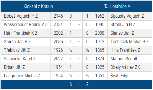 První skončila partie na první šachovnici, kde Vojta špatně zareagoval na polokorektní postup černého ve španělské a prohrál. Ani na zbylých šachovnicích jsme v tu dobu nestáli nějak růžově, takže se klíčový zápas začal hned na startu komplikovat. Obrat nastartovala výhra Káji, který sice byl v partii několikrát prohraný ale nakonec soupeři pomocí smrtelné vazby odebral figuru i bod. Přesvědčivě hned v zápětí vyhrál Radek s Honzou stylem start cíl. Další bod jsem přidal já po boji proti sicilskému drakovi.