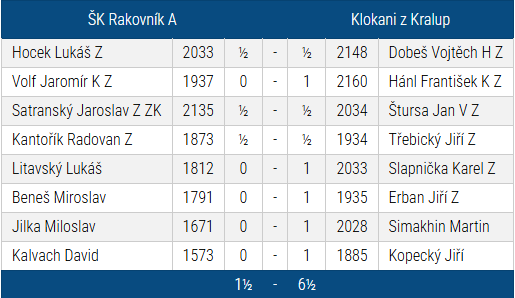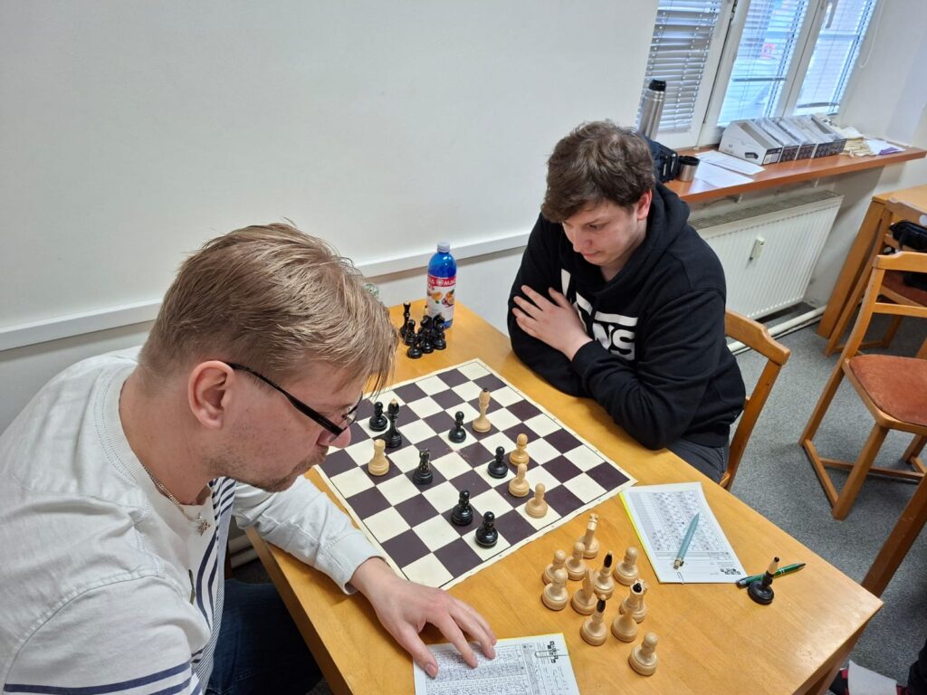 Konečně zase vítězství. Výsledek 6.5 – 1.5 vypadá dominantně, ale zápas mohl skončit všelijak, a to i přes velkou elovou převahu na posledních třech šachovnicích, kde jsme zhruba po hodině hry již mohli počítat se třemi body. K tomu přidal Vojta na první zkušenou remízu a vše vypadalo nadějně. Zápas však teprve začínal a ukázalo se, že nejdůležitější výsledek bude na čtvrté a páté šachovnici, kde se, pekařskou terminologii řečeno, lámal chleba.