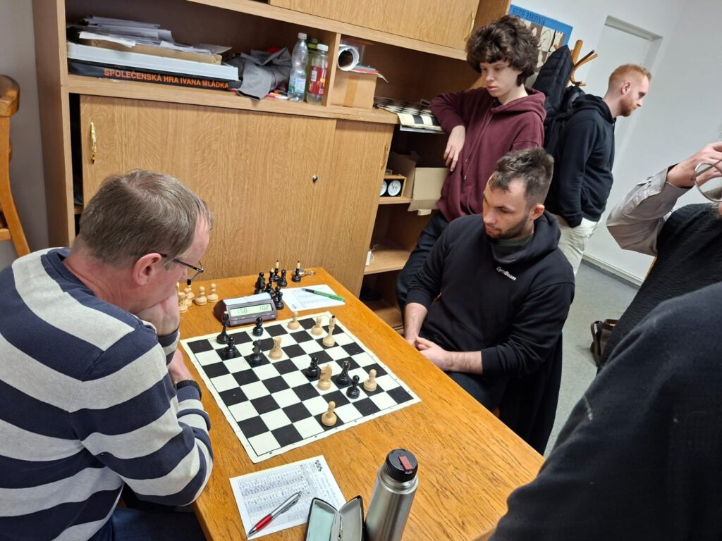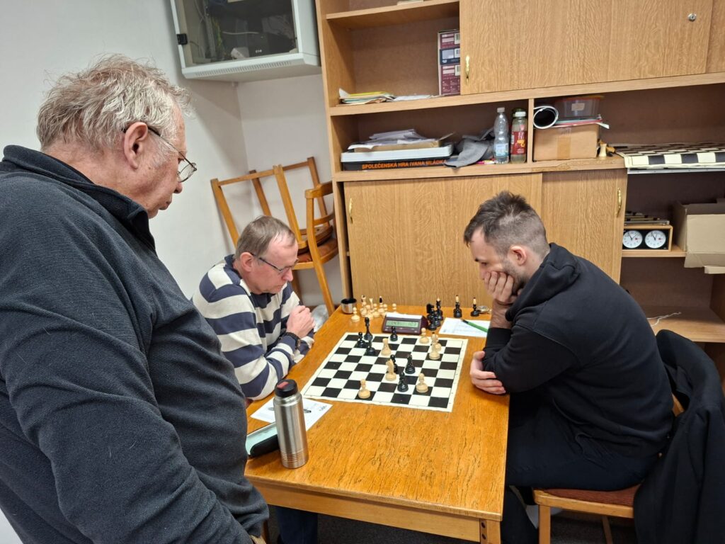 Z pomyslného krajíce oba naši hráči získali menší kousek než soupeři a po zápletkách střední hry oba stáli na prohru. Prohraná pozice jim ale nezabránila bodovat, a tak Kája nakonec svou pozici otočil a vyhrál rovnou koncovku a Jirka udržel pozici s pěšcem míň. Na třetí šachovnici se ještě blýskl Honza, když odremizoval nejsilnějšího hráče soupeřů. Já jsem taky nakonec vyhrál, byť soupeř v časovce přehlédl remízu věčným šachem.