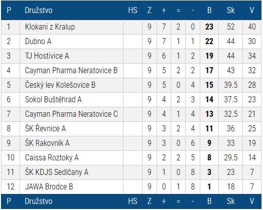 Odjížděli jsme tak ve veselé náladě, která nám vydržela asi deset minut, než jsme po telefonátu soupeřů zjistili, že se Jirka rozhodl si kromě tří bodů odvézt i klíče od hrací místnosti. Tak jsme vrátili sebe i klíče a znovu odjeli. V předposledním kole nás čekají Hostivice a brána k titulu je už nadohled.